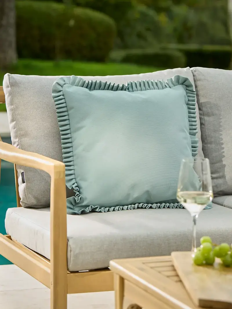 In a soothing shade of duck egg blue, our Thistlefrill Outdoor Cushion lends an effortlessly elegant touch to alfresco spaces. The gentle tone complements both natural timber and modern stone finishes, creating a refined sense of calm. Finished with a delicate frilled edge, its tactile weave is made from a shower-proof and UV-resistant polyester, allowing it to look beautifully fresh all season long. Designed to elevate your outdoor seating with both comfort and quiet sophistication, it's the perfect finishing touch for a thoughtfully dressed garden retreat.
