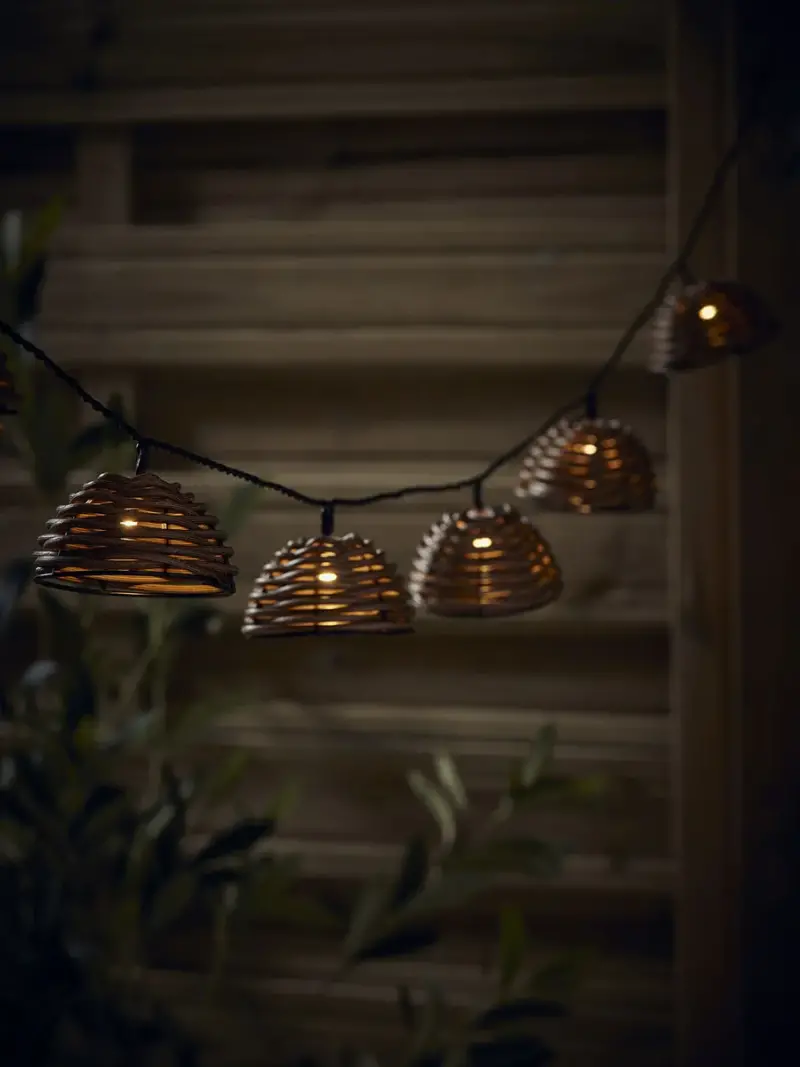 Sweet little faux rattan shades cover small warm white bulbs, creating a string of tiny lampshades to hang across your garden.In a set of three, these lights can be connected allowing for a long string of lights to be positioned across your garden and light your space in a beautiful and delicate way. Discover how to create the perfect lighting scheme for your home using our Lighting Buying Guide.