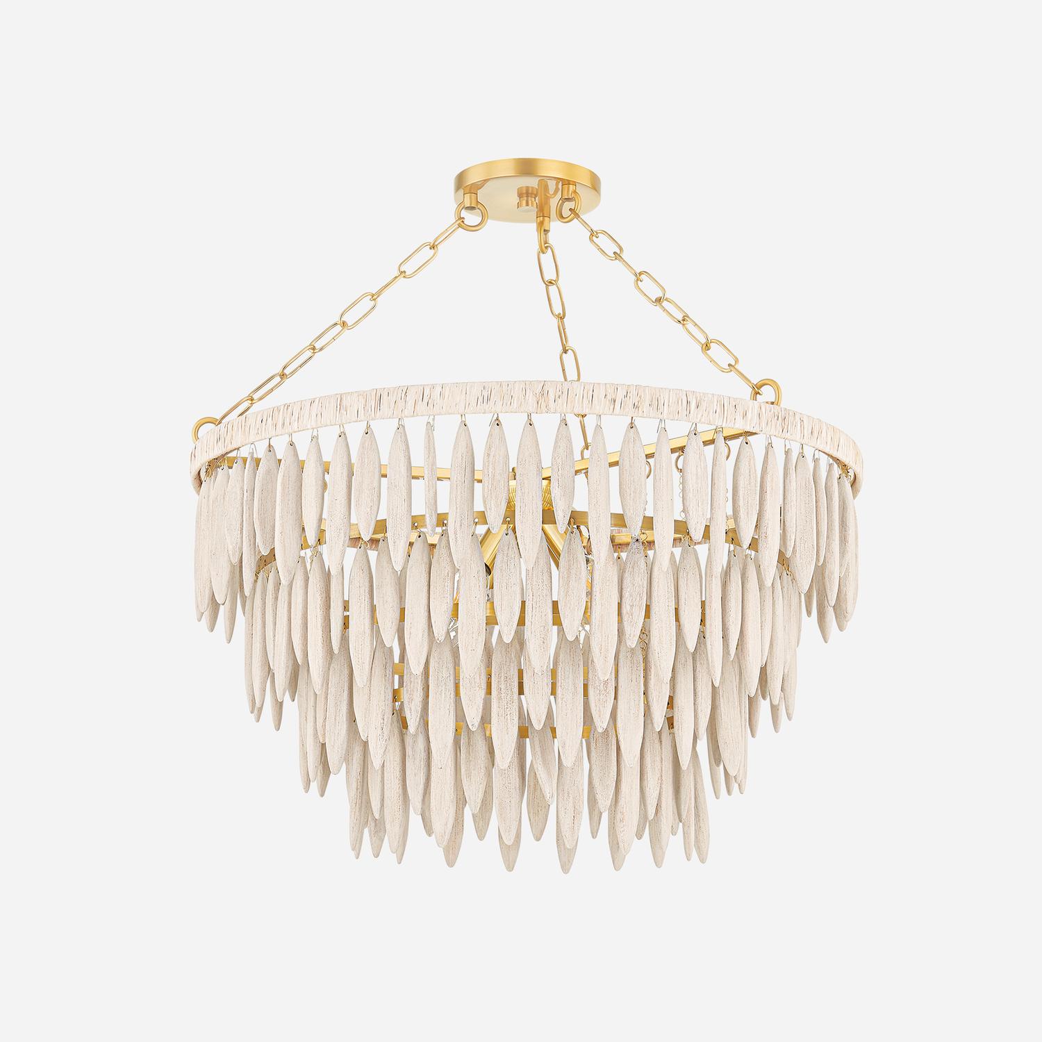 Discover the Tiffany Chandelier in Aged Brass – a coastal-inspired, organic design that brings elegance and warmth to any room with its white-washed wood beads and luxurious finish. Tiffany Chandelier, Light, White - Andrew Martin