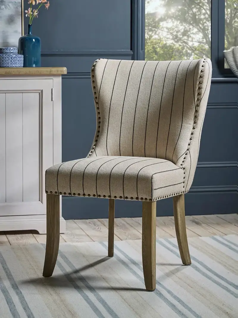 This striking upholstered dining chair features a gentle winged back design, upholstered in a neutral oatmeal-toned linen and viscose blend fabric with a stylish French blue stripe. The chair's outline is accentuated by brass upholstery tacks, adding a sophisticated finishing touch. Supported by subtly flared ash wood legs, this chair offers both comfort and elegance. Whether your home leans towards a contemporary or country style, this dining chair will seamlessly integrate into your dining space, providing a comfortable and elegant dining experience.