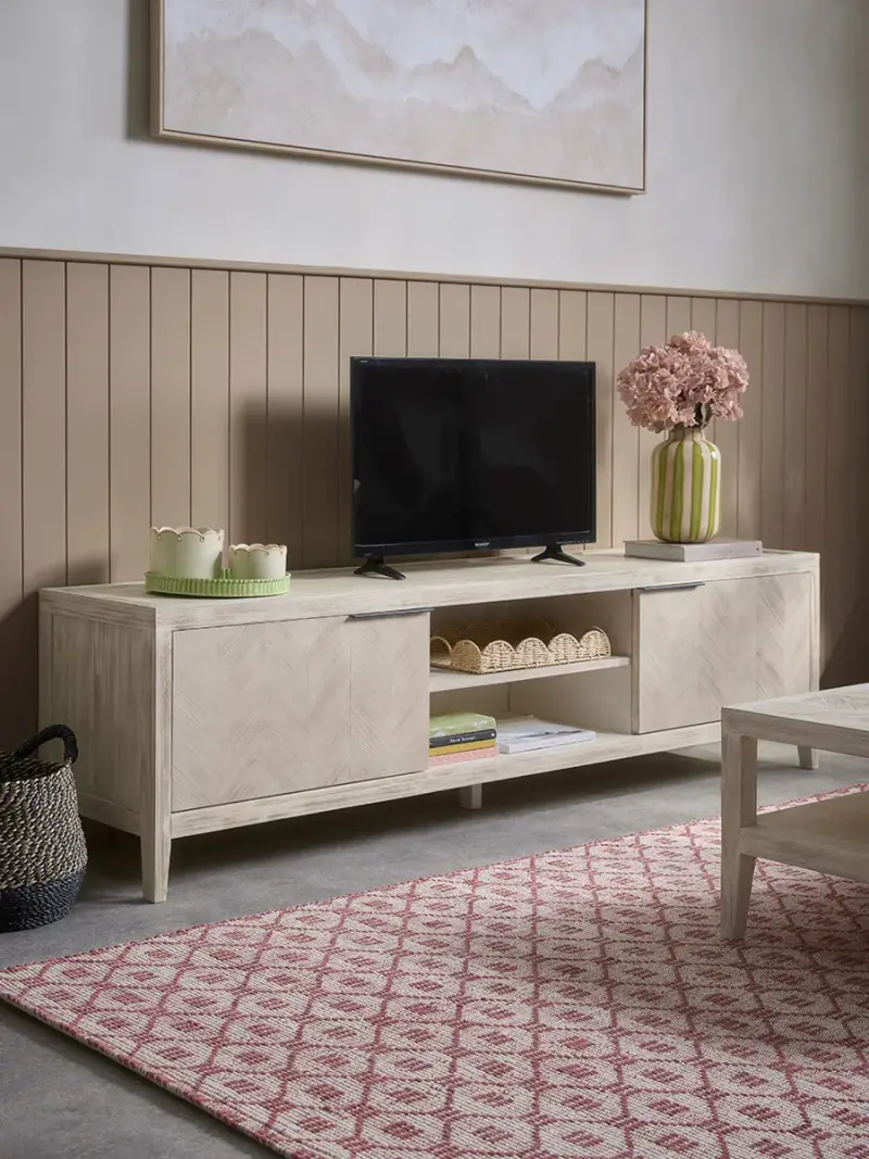 Elevate your living space with the understated sophistication of our Tova Limewashed Media Unit, a beautifully handcrafted piece from our Scandi-inspired Tova furniture collection.Designed to balance style and practicality, this limewashed wood TV stand features two side cupboards for concealed storage as well as central open shelves that are perfect for housing your media devices, books, or decorative accents. Expertly crafted from pale fir wood with a light limewashed finish, the unit showcases the range's signature chevron-patterned parquet detailing, simple square silhouette, and slightly tapered legs for a clean, modern look. Finished with sleek aluminium alloy strip handles, this Scandinavian-style media console brings natural warmth and timeless craftsmanship to any interior.