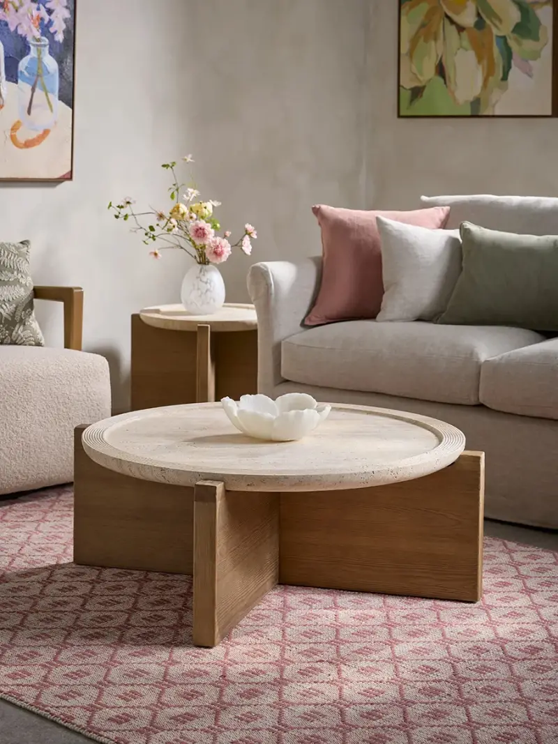 With its clean, Scandi-inspired aesthetic, this coffee table brings effortless simplicity to your living space.Crafted from solid pine, the base features two intersecting slabs that slot together in a striking cross formation, creating a sculptural yet balanced foundation. Resting above, the travertine tabletop introduces a natural contrast, its softly textured surface adding depth and a refined, contemporary touch.