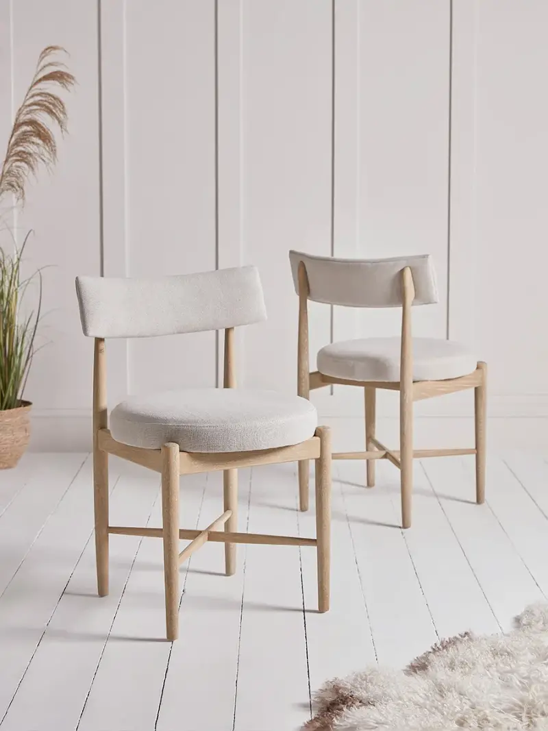 Our Baylin Dining Chairs enjoy pared-back Scandinavian-inspired styling. Pale bleached wooden frames in oak support round cushioned seats and curved upholstered backrests for a comfortable chair.Shown here with our Quinn Dining Table, these chairs, which are sold in pairs will pair happily with many of our tables to create a welcoming dining space.