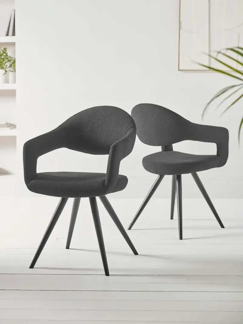 Introduce stylish neutrals to your dining space with our stunning Bouclé Dining Chairs. Fully upholstered in a teddy bear soft black fabric, the chairs are sold as a pair and offer comfortable curves, cocooning arms and matching black metal legs. Perfect for a sophisticated but cosy setting. Also available in white and as a counter stool.