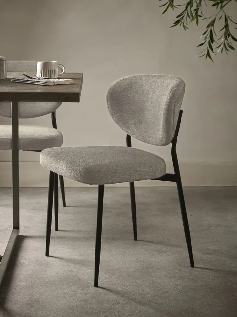 These contemporary dining chairs offer a touch of modern industrial elegance to any dining setting. Upholstered in a soft, textured grey fabric, they feature unique oval-shaped backrests and comfortable, plush seats. The matte black iron legs provide a stylish contrast, completing the overall design.These chairs are sold in pairs.