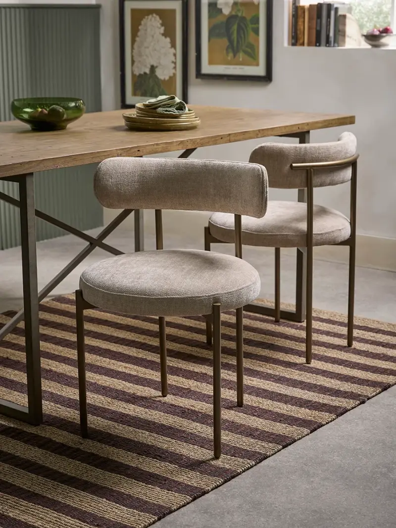 In a set of two, our Kiera Dining Chairs introduce contemporary texture and modern styling to your dining area.Slim bronze legs add an elevated luxury, while the neutral upholstered seat pads create a softness. The curved back gives a refined look that offers plenty of support, creating a comfortable place to sit.