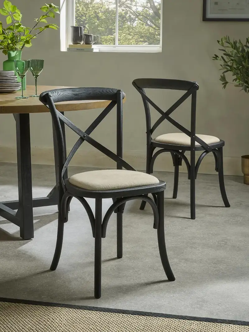 Inspired by classic French café designs paired with the farmhouse cross-back style, our set of two oak cross-back dining chairs in black gives a traditional look in your home, whilst offering a contemporary feel to your dining space.With a red oak and plywood frame, painted in black, the foam-filled seat pad is upholstered in neutral tones, offering a comfortable place for everyday dining.