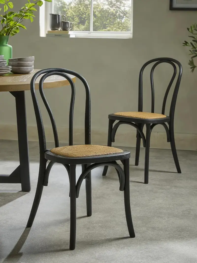 With a certain farmhouse charm, our set of two prato dining chairs offers a modern take on a traditional design.Red oak frames are painted black for a striking look that contrasts with the light seat pad of a dining chair, making it a perfect choice for a home that celebrates a contemporary style while enjoying elevated designs.