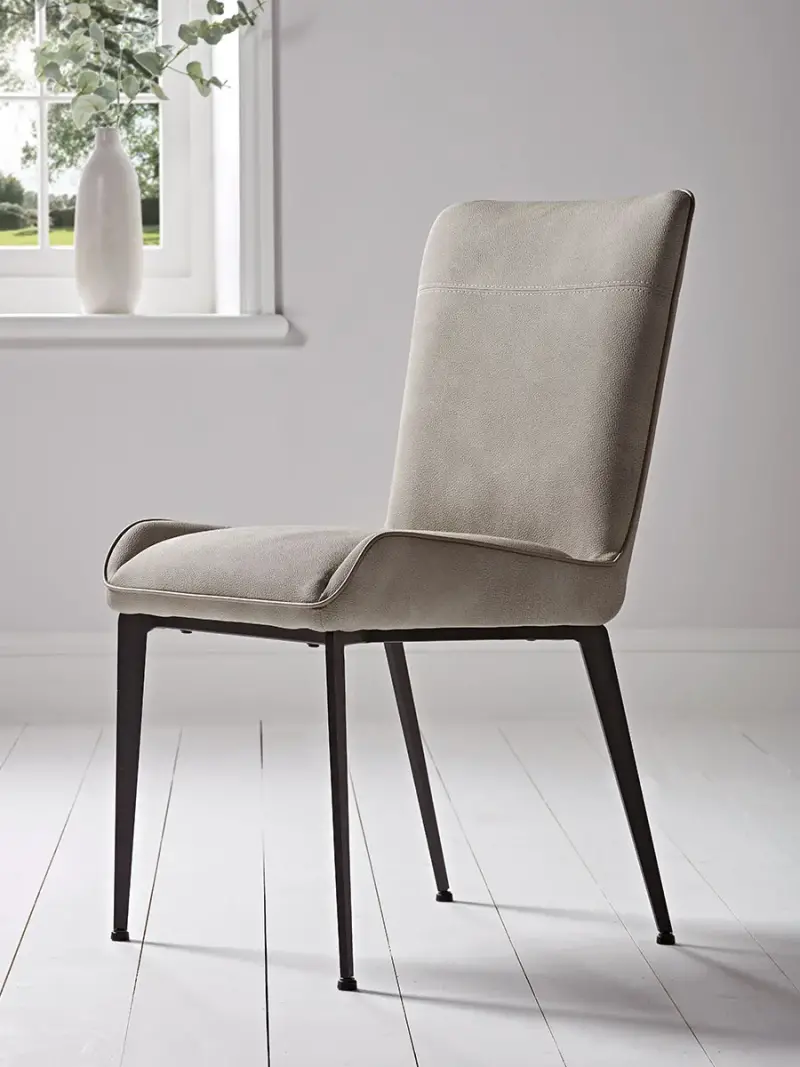 Coupling a dark bold toned frame with a soft realistic faux leather gives this pair of dining chairs a relaxed modern style. Each chair has a simple yet sumptuous silhouette, with a grey stitched curved seat and a comfortable padded backrest.
