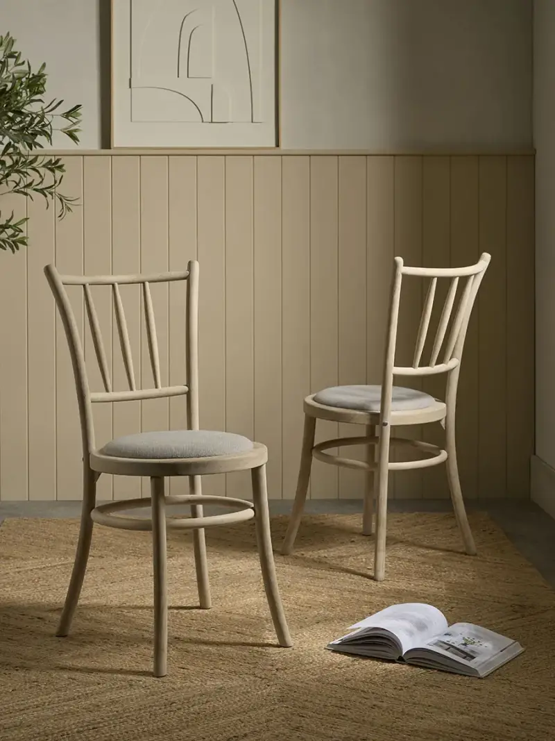 A contemporary take on a classic bentwood design, our Spindle Back Dining Chairs will bring charm to any kitchen or dining room table. The gentle splay to the leg and backrest spindle adds character to these chairs, which are handmade in white oak and offer the additional comfort of a padded and upholstered seat. These dining chairs are sold in pairs.