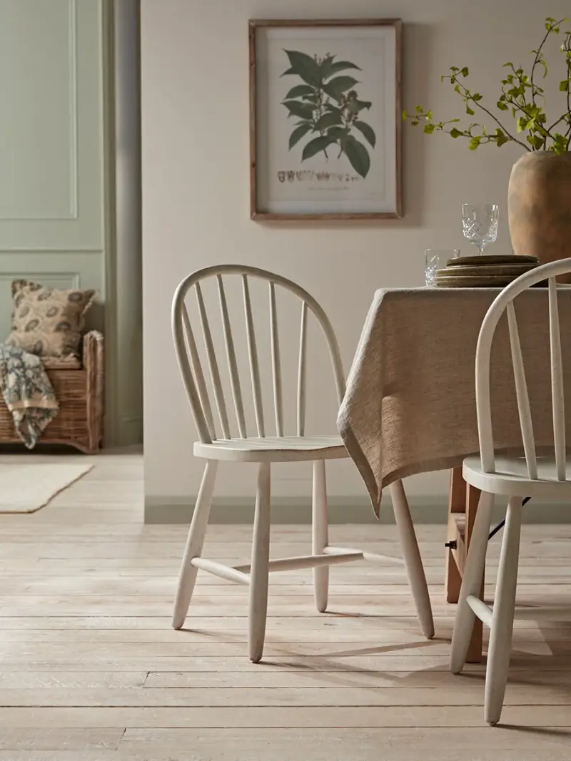 With a classic spindle back design, this set of two dining chairs have a simple and delicate frame.Crafted from birch, the white painted wood has a distressed finish for a rustic look that fits perfectly in an interior that embraces a neutral and minimalist scheme.