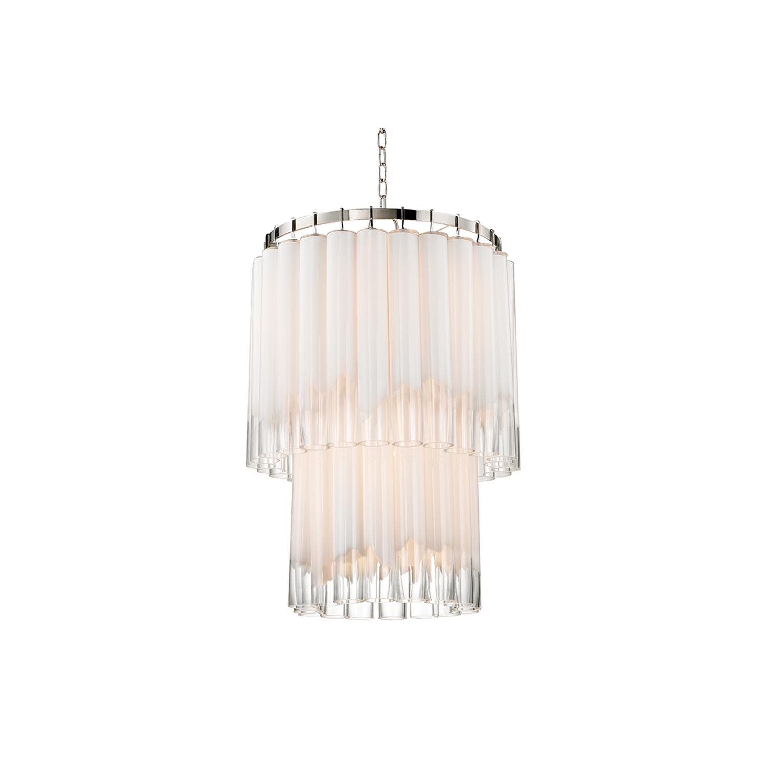 The Tyrell Chandelier in polished nickel features a unique glass technique, offering a striking and contemporary lighting solution for any room. Tyrell, Light, Nickel - Andrew Martin