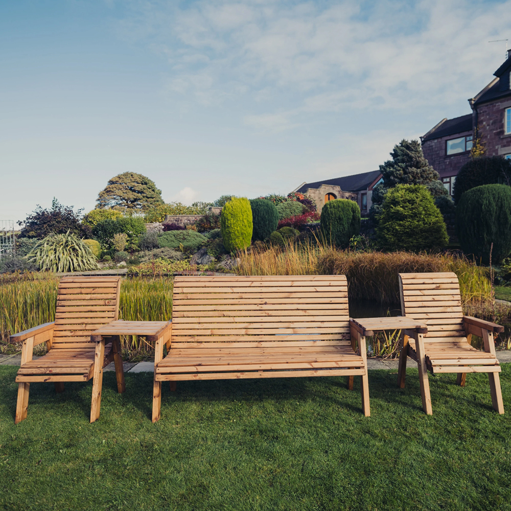Transform your outdoor space into a comfortable and social retreat with the Vail Garden Wooden Multi Seating Set in Natural from Furniture in Fashion. Designed for both relaxation and entertaining, this beautifully crafted seating set combines rustic charm with practical functionalitymaking it ideal for gardens, patios, and outdoor lounging areas. Crafted from high-quality FSC-certified timber, this multi seating set showcases the natural beauty of wood while offering durability for long-term outdoor use. With a versatile layout that typically includes a bench, chairs, and connecting tables, it creates a cohesive seating arrangement perfect for gatherings with family and friends. Its handcrafted design and pre-treated wood ensure resistance to outdoor elements while maintaining its timeless appeal. The Vail Garden Wooden Multi Seating Set in Natural by Furniture in Fashion offers the perfect blend of comfort, durability, and timeless design, making it an excellent choice for creating a stylish and inviting outdoor seating area for relaxing and entertaining. FEATURES: Material: Wooden Finish: Natural The set consists of 1 x 3-seater bench and 2 x chairs and comes with handy straight trays that rest on the arms connecting the chairs and benches The Valley 5 Seater set is designed with comfort and durability in mind It has a beautiful golden oak finish that will add natural charm to any outdoor space The tray lifts on and off with ease, allowing you the freedom to relocate the chairs easily in your garden Made from the finest FSC-certified Swedish Redwood This product has been treated with a base coat for protection, ensuring long-lasting durability To maintain its condition and protect against rot, we recommend re-treating the wood annually Please note seat cushions are not included and can be purchased separately Screwed and bolted Swedish Redwood Pre-treated timber Available at an affordable price Images shown are for Illustrative Purp