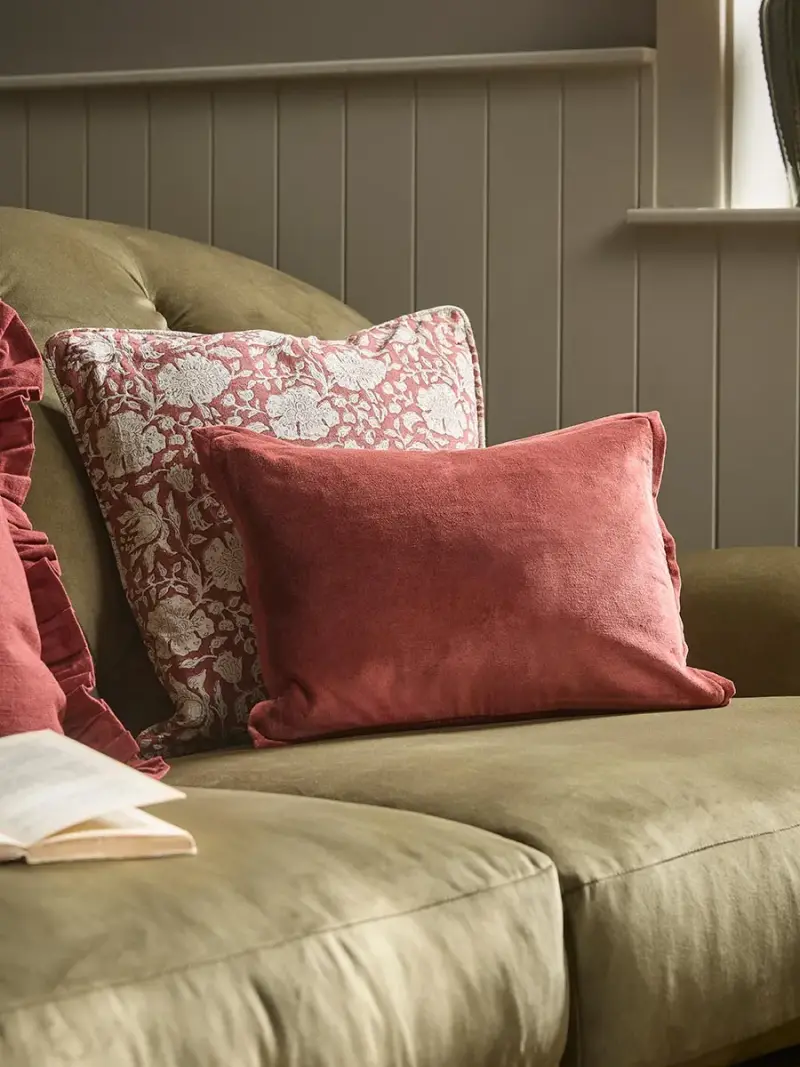 Bring a refined, layered look to your seating with our Velvet & Cotton Linen Rectangular Cushion Cover in Deep Red. The elongated shape is perfect for adding structure to sofas or beds, creating contrast when paired with square cushions. A sumptuously soft velvet front in a rich deep red introduces warmth and depth, while the natural cotton linen reverse keeps the look relaxed and balanced. Finished with a fine Oxford edge, it adds a tailored touch that feels both considered and timeless. Ideal for creating a polished, well styled arrangement, this rectangular cushion cover brings elegance, texture and versatility to your space. This cushion cover is suitable for a 30 x 40cm cushion pad, which is available separately.