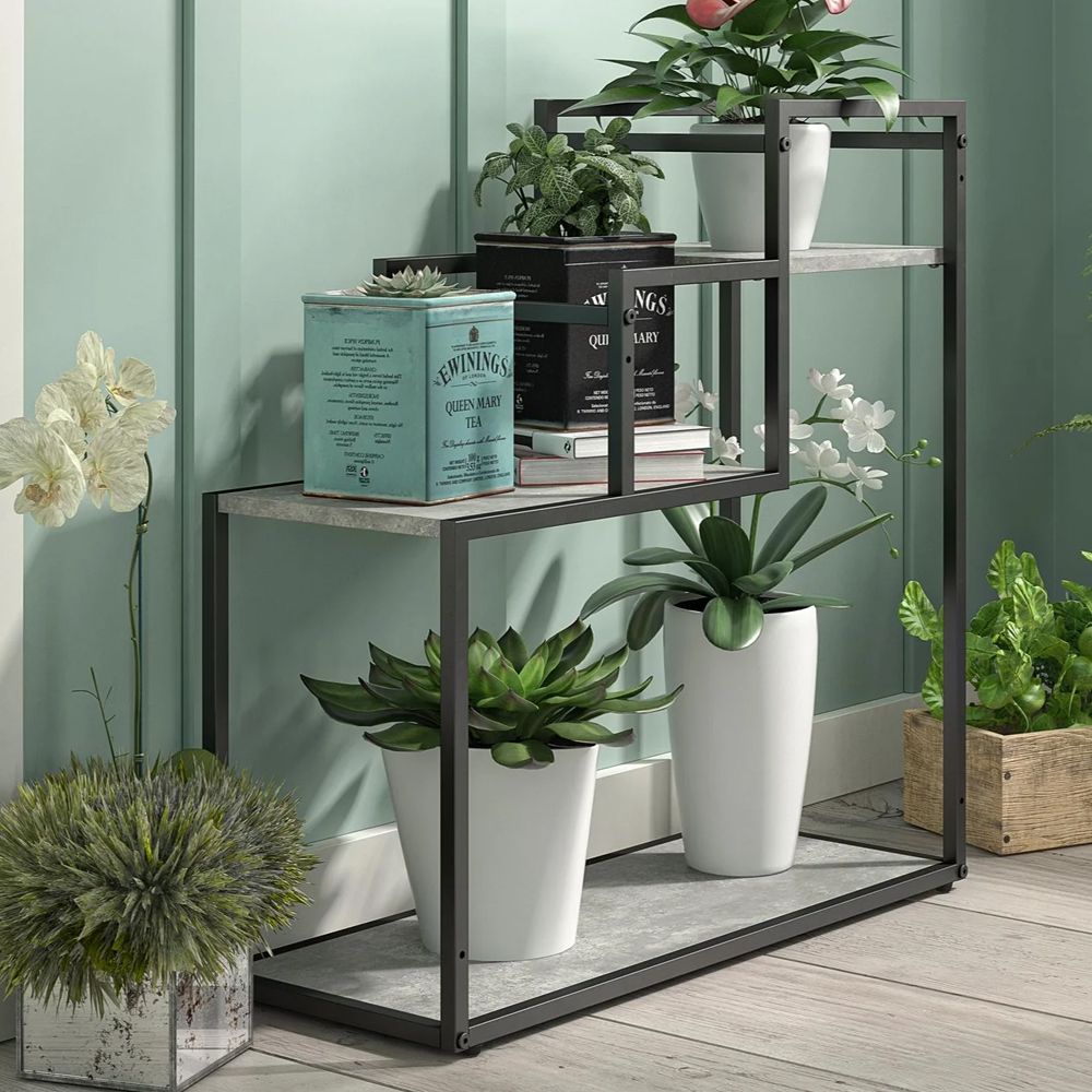 Add a touch of industrial charm to your home decor with the Warton Wooden Plant Stand with Metal Frame in Light Concrete from Furniture in Fashion. This stylish and compact plant stand is perfect for showcasing your favourite indoor plants, adding height, texture, and elegance to any room. Whether you're displaying vibrant greenery or decorative pots, the Warton plant stand creates a striking focal point in modern and contemporary interiors. Crafted with a sturdy Light Concrete metal frame and a warm wooden top, this plant stand offers the perfect balance between rustic and modern design. Its slim and space-saving structure makes it ideal for small apartments, living rooms, hallways, or balconies. A versatile accessory that effortlessly elevates your plant display while enhancing the overall aesthetic of your space. Enhance your home decor with the Furniture in Fashion Warton Wooden Plant Stand a stylish solution for displaying plants with elegance and ease. Ideal for any modern or minimalist setting. FEATURES : Material : Wooden, Metal Finish : Light Concrete Add a little green to your space with the Warton Plant Stand The Light Concrete oak woodgrain finish on the laminated particleboard shelves pairs with the powder-coated metal frame for a modern, industrial look The step design adds to the visual appeal of this piece The top 2 smaller shelves are ideal for individual potted plants while the larger lower shelf can hold several pots and even collectibles and decorations The Plant Stand ships flat to your door and requires assembly upon opening Two adults are recommended to assemble Once assembled, the Plant Stand measures to be 23. 39H x 23. 03W x 8. 94D Bring the outdoors in with the Warton Plant Stand Made of laminated particleboard and powder-coated metal frame, the Light Concrete oak woodgrain finish pairs with the metal frame for a trendy industrial look The 2 smaller shelves can hold individual potted plants while the larger lower