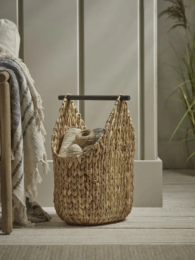 Crafted from natural materials, this large basket has a variety of uses. A wooden handle makes it easy to transport from room to room. Or even use the bar as a place to hold toilet roll, for a stylish and creative solution to bathroom storage.In its neutral tones, this basket works in a variety of interior schemes for storage that is as stylish as it is practical, and adds a soft and rustic touch to your home.