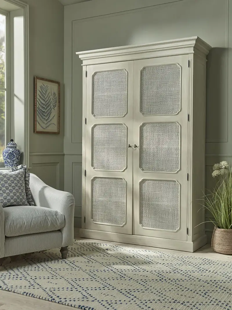 Inspired by minimalist and light living, this display cabinet brings all the joy of a warmer clime to your home.Crafted from Bayur wood, the simple silhouette is painted in an off-white tone, adding a lightness to the frame. And when paired with the rattan doors is given a whimsical and airy feeling, perfect for a home that embraces a relaxed colour palette.Finished with dark metal door handles, this display cabinet is perfect for keeping your home looking organised.