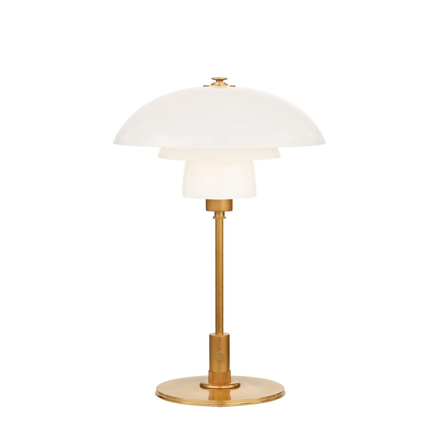 Desk lamp in smart hand-rubbed antique brass with contrasting white glass shade. Crafted by Thomas O’Brien, with a nod to Art Deco style and enough quirk for modern interiors too. Whitman Table Lamp White, Desk Lamp, Antique Brass/White - Andrew Martin