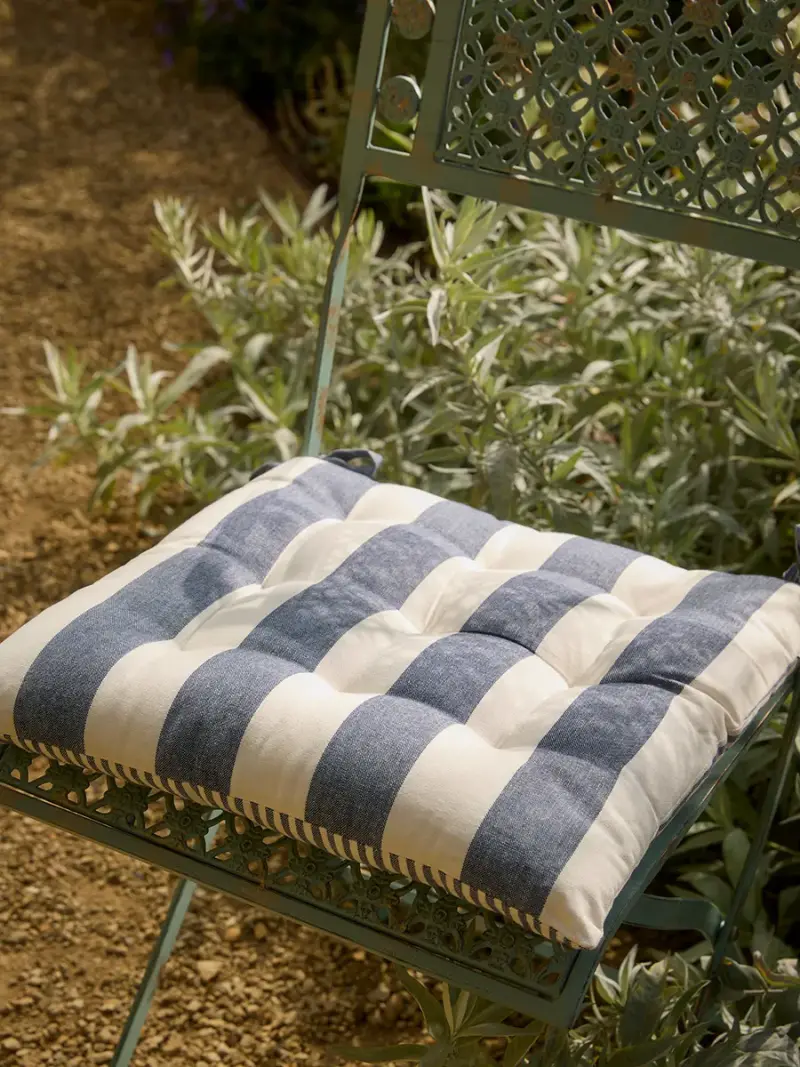 Add a touch of coastal charm and comfort to your garden seating with this beautifully crafted outdoor seat pad. Designed in soft blue and cream chunky stripes, it brings a fresh, timeless aesthetic to garden furniture nestled in sun-dappled corners or seaside-inspired spaces.Generously quilted for lasting comfort, the pad features a reverse of petite, fine stripes, offering a subtly textured contrast, and can be neatly secured to your chair with simple ribbon ties.Perfect for leisurely breakfasts outdoors or tranquil evenings under the stars, this cushion pairs effortlessly with all furniture styles and materials, creating an inviting and serene outdoor retreat.