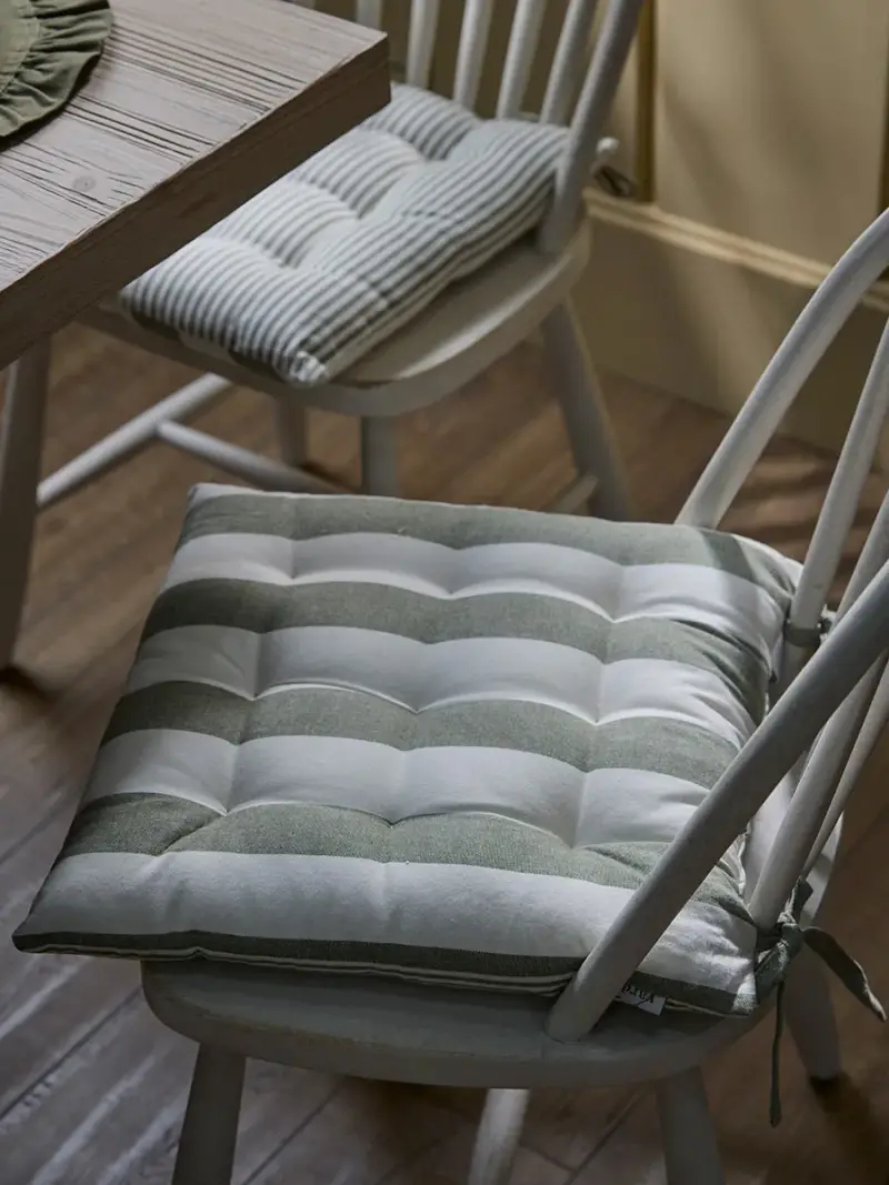 Add a touch of country charm and comfort to your garden seating with this beautifully crafted outdoor seat pad. Designed in a soft sage and cream chunky stripe, it brings a relaxed, timeless aesthetic to garden furniture in sun-dappled corners of your garden.Generously quilted for lasting comfort, the pad has a reverse of smaller, petite stripes, offering a different textured design, and can be secured to the chairs with simple ribbon ties.Perfect for lazy breakfasts outdoors or evenings spent beneath the stars, this cushion pairs beautifully with all material types for an effortlessly inviting outdoor setting.