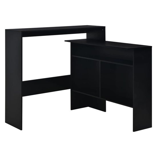 This bar table is both functional and stylish, which will make a practical and captivating addition to your interior. FEATURES : Material : Chipboard Finish : Black The special design of the high table makes it a timeless accessory for your living space Thanks to the sturdy chipboard construction, the side table is highly durable, stable and easy to clean The table tops will provide ample space for you to place your drinks, vases or other decorative items The bar table is easy to assemble Inner table is movable Available at an affordable price Images shown are for illustration purpose only TOTAL DIMENSIONS : Height : 120cm Width : 130cm Depth : 40cm INNER TABLE DIMENSIONS : Height : 100cm Width : 124cm