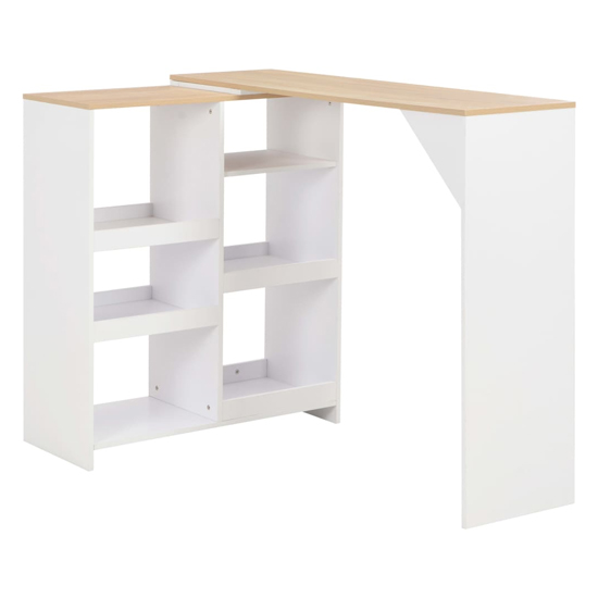 Our bar table is the perfect choice for rooms where space is a little limited due to its moveable shelf. Its contemporary design makes the table a chic addition to your kitchen or dining area. FEATURES : Material : Chipboard Finish : Oak, White Made of sturdy chipboard, it is durable, stable and easy to clean The L-shaped frame and table reinforcement triangle give the table optimum stability Additionally, with the ideal height and special design, this high table will certainly complete the decoration of your house Feel comfortable and enjoy a drink or meal with your family or friends The shelf is moveable The bar table is easy to assemble Available at an affordable price Images shown are for illustration purpose only TABLE DIMENSIONS : Height : 110cm Width : 138cm Depth : 39cm SHELF DIMENSIONS : Height : 107cm Width : 90cm Depth : 39cm