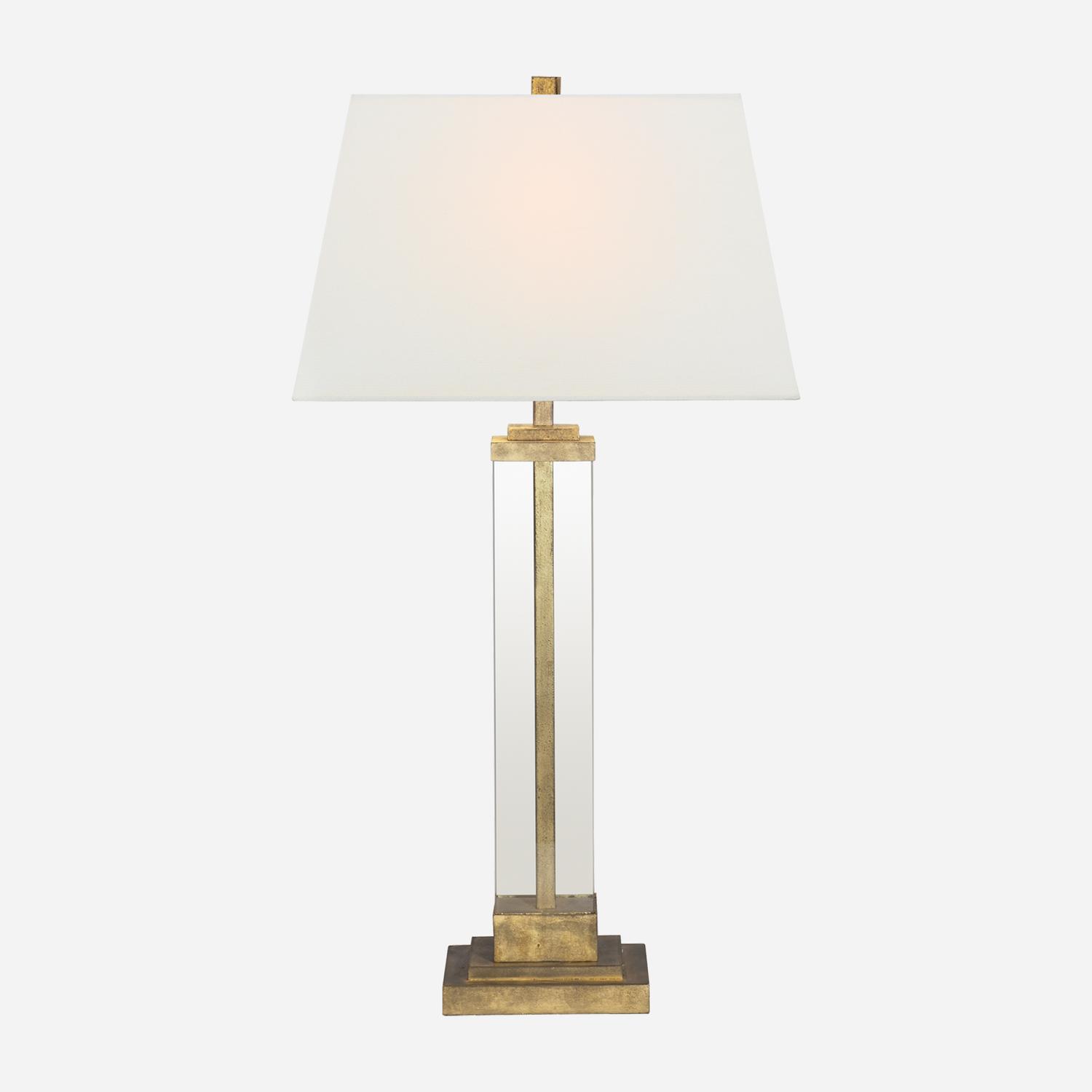 Sophisticated table lamp with a gilded iron base surrounded by a clear glass stem and topped with a natural shade, adding a smart, contemporary finish to a room. Wright Table Lamp, Table Lamp, Gilded Iron - Andrew Martin