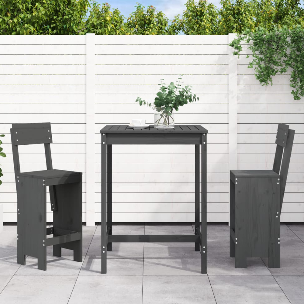 Upgrade your outdoor entertaining area with the Furniture in Fashion Xandor Garden Solid Wood Bar Table with 2 Stools in Grey, designed to combine modern simplicity with natural durability. Featuring a sleek grey finish and clean Scandinavian-inspired lines, this compact bar set adds a contemporary yet rustic charm to patios, balconies, gardens, and terraces. Crafted from high-quality solid pine wood, this 3-piece bar set is built for strength, stability, and long-lasting outdoor use. The set includes a square bar table and two matching stools, offering a practical solution for casual dining, drinks, or social gatherings. Its space-saving design makes it ideal for smaller outdoor spaces, while the sturdy construction ensures reliable everyday performance. The Furniture in Fashion Xandor Garden Solid Wood Bar Table with 2 Stools in Grey is a stylish and practical addition to any outdoor space. With its durable solid wood construction, compact design, and modern finish, it offers the perfect solution for relaxed outdoor dining and entertaining. FEATURES: Material: Solid Pinewood Finish: Grey Set Included: 1 x Bar Table, 2 x Stools Take a sip of your favourite drink or enjoy a nice meal with your family and friends around this wooden garden bar set This bar set is made of solid pine wood Solid pine wood is a beautiful natural material Pine wood has a straight grain, and the knots give the material its signature, rustic look The bar table of the pub set has a sturdy top, which is perfect for placing your drinks, food and other decorative items The backrest and footrest of the wooden bar stool provide a comfortable seating experience to relax your back and legs With its minimalist design, the patio bar set can be integrated into any corner of the garden, patio, balcony, backyard, etc Good to know: To make sure your outdoor furniture stays beautiful, we recommend protecting it with a waterproof cover Maximum load capacity (per seat): 110kg Perfec
