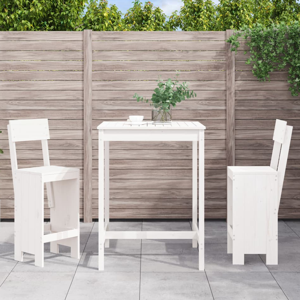 Brighten up your outdoor space with the elegant Furniture in Fashion Xandor Garden Solid Wood Bar Table with 2 Stools in White, designed to bring a fresh and modern look to any setting. Featuring a clean white finish and minimalist Scandinavian-inspired design, this compact bar set adds a stylish and airy feel to patios, balconies, gardens, and terraces. Crafted from high-quality solid pine wood, this 3-piece bar set offers excellent durability and stability for long-term outdoor use. The set includes a sturdy square bar table and two matching stools, perfect for casual dining, drinks, or social gatherings. With its space-saving design and versatile appeal, it fits seamlessly into smaller outdoor areas while delivering both comfort and functionality. The Furniture in Fashion Xandor Garden Solid Wood Bar Table with 2 Stools in White is a perfect blend of style, durability, and practicality. With its solid wood construction, compact design, and bright modern finish, it offers an ideal solution for outdoor dining and entertaining in any space. FEATURES: Material: Solid Pinewood Finish: White Set Included: 1 x Bar Table, 2 x Stools Take a sip of your favourite drink or enjoy a nice meal with your family and friends around this wooden garden bar set This bar set is made of solid pine wood Solid pine wood is a beautiful natural material Pine wood has a straight grain, and the knots give the material its signature, rustic look The bar table of the pub set has a sturdy top, which is perfect for placing your drinks, food and other decorative items The backrest and footrest of the wooden bar stool provide a comfortable seating experience to relax your back and legs With its minimalist design, the patio bar set can be integrated into any corner of the garden, patio, balcony, backyard, etc Good to know: To make sure your outdoor furniture stays beautiful, we recommend protecting it with a waterproof cover Maximum load capacity (per seat): 110kg Perfect