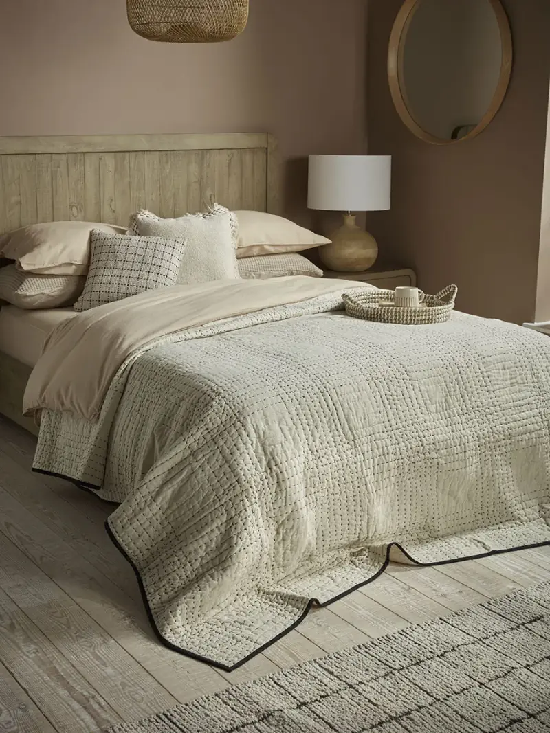 Our Yvoire Throw features a grid design of quilting stitches in black thread which contrasts with the warm toned neutral base fabric.The front of the throw is a warm beige linen and cotton fabric, while the reverse is in white cotton. The edges are bound in black cotton for a smart finish.This lightweight piece will add a refreshing update to beds and sofas for the new season.