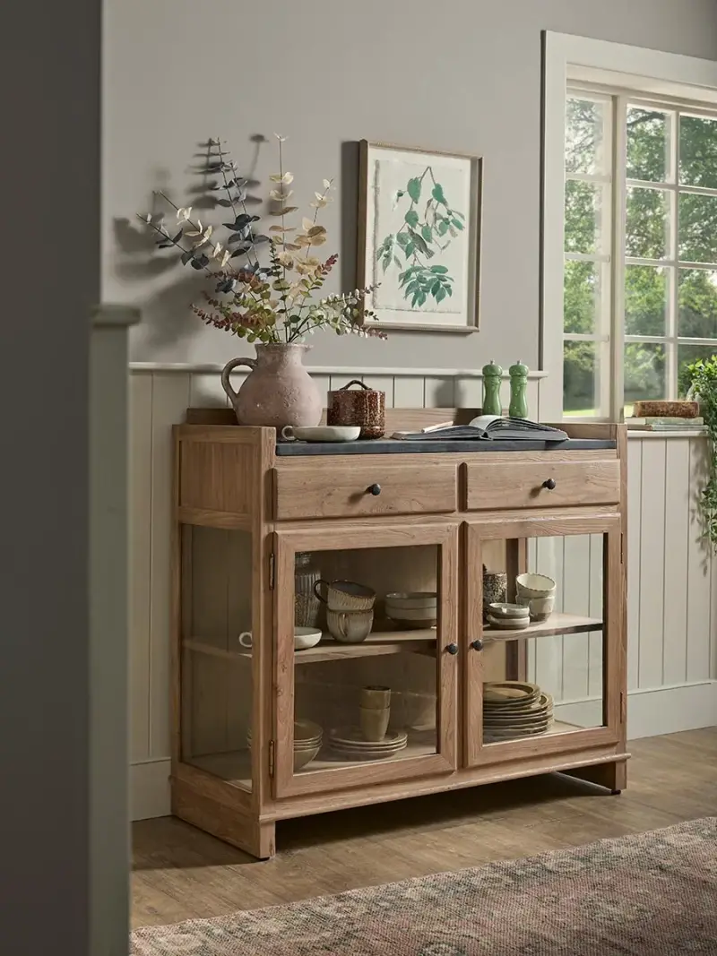 Bring warmth and relaxed character to your home with our Zadar Display Cabinet.Crafted from beautifully grained wood, its softly classic design features glass-fronted doors that allow you to showcase ceramics, tableware or treasured pieces with ease. The two upper drawers provide practical storage for smaller essentials, while the spacious shelving below keeps everything neatly organised yet on display.Perfect for kitchens, dining rooms or living spaces, our Zadar Display Cabinet blends everyday functionality with timeless style, creating a welcoming focal point that feels both practical and thoughtfully designed.