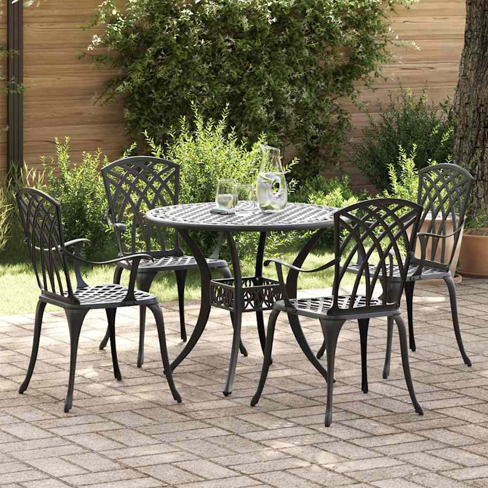 Upgrade your outdoor dining space with the elegant and contemporary Zanaro Garden Aluminium Intricate Mesh Dining Table with 4 Chairs in Black by Furniture in Fashion. Designed to deliver both visual appeal and everyday functionality, this stylish dining set features a detailed intricate mesh pattern combined with a sleek black finish-perfect for enhancing patios, gardens, balconies, and terrace settings. Its modern design effortlessly complements a wide range of outdoor decors while creating a welcoming space for dining and relaxation. Crafted from high-quality aluminium, this 5-piece dining set offers exceptional durability and resistance to outdoor elements. Aluminium is widely recognised for being lightweight, rust-resistant, and long-lasting, making it ideal for year-round outdoor use. The intricate mesh design not only adds a decorative touch but also promotes airflow and quick drying after rain, ensuring both comfort and practicality for everyday use. The Furniture in Fashion Zanaro Black Aluminium Intricate Mesh Garden Dining Set combines durability, comfort, and refined design. Ideal for modern outdoor living, it offers a stylish and practical solution for relaxed dining and entertaining. FEATURES: Material: Aluminium Finish: Black Set Include: 1 x Dining Table, 4 x Chairs This Cast Aluminium Garden Dining Set is a beautiful addition to any outdoor garden or terrace With a classic and traditional style, it seamlessly complements a range of outdoor themes, promising elegance and functionality with each use The set's Aluminium build not only enhances its aesthetic appeal but also ensures resilience It is tailored for warm-weather enjoyment and can accommodate any casual or formal outdoor dining experience, making it perfect for anyone who relishes outdoor entertaining The dining set is crafted entirely from Aluminium, renowned for its robustness and resistance to weather conditions This ensures that the set remains a durable investment for a