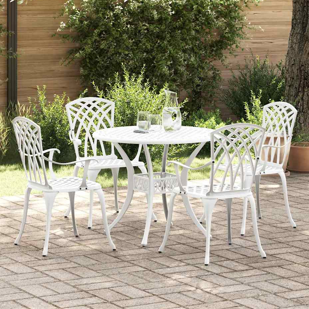 Brighten your outdoor living space with the elegant and contemporary Zanaro Garden Aluminium Intricate Mesh Dining Table with 4 Chairs in White by Furniture in Fashion. Designed to deliver a perfect balance of style and functionality, this sophisticated dining set features a crisp white finish paired with an intricate mesh pattern, creating a fresh and inviting atmosphere for patios, gardens, terraces, and balconies. Ideal for both everyday dining and entertaining guests, it enhances any outdoor setting with modern charm. Expertly crafted from high-quality aluminium, this 5-piece dining set offers exceptional durability and all-weather performance. The rust-resistant and weatherproof construction ensures long-lasting use, while the lightweight frame allows easy repositioning. The intricate mesh design not only elevates the visual appeal but also promotes airflow and quick drying after rain, making it a practical choice for outdoor environments. Aluminium furniture is widely recognised for its strength, low maintenance, and resistance to outdoor elements. The Furniture in Fashion Zanaro White Aluminium Intricate Mesh Garden Dining Set offers a perfect combination of durability, comfort, and modern elegance. Designed for practical outdoor living, it provides a stylish and reliable solution for relaxed dining and entertaining. FEATURES: Material: Aluminium Finish: White Set Include: 1 x Dining Table, 4 x Chairs This Cast Aluminium Garden Dining Set is a beautiful addition to any outdoor garden or terrace With a classic and traditional style, it seamlessly complements a range of outdoor themes, promising elegance and functionality with each use The set's Aluminium build not only enhances its aesthetic appeal but also ensures resilience It is tailored for warm-weather enjoyment and can accommodate any casual or formal outdoor dining experience, making it perfect for anyone who relishes outdoor entertaining The dining set is crafted entirely from Aluminium