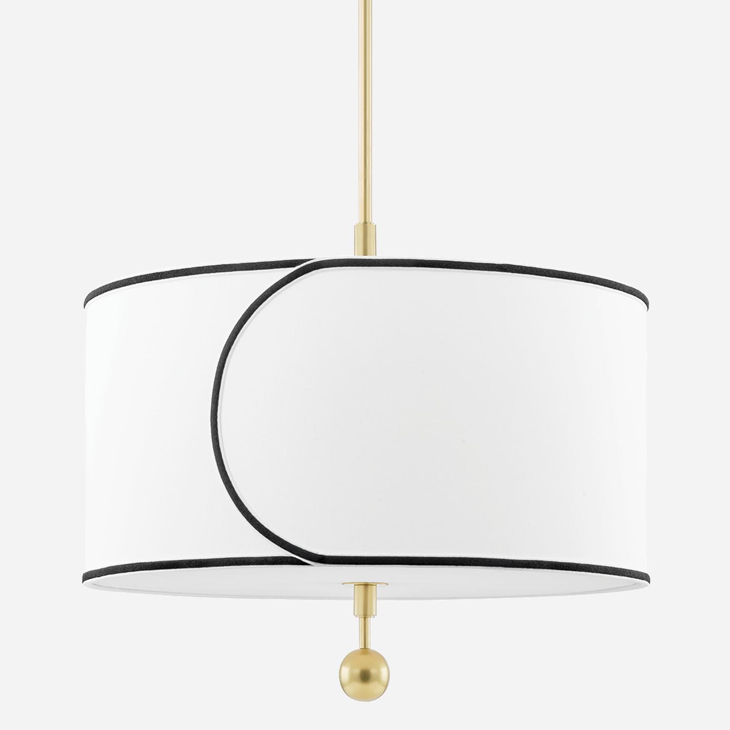 Classic white linen pendant A classic reimagined, the Zara features a white, Belgian-linen drum shade with black trim and has an overlapping design that marches to its own beat. A metal finial in Aged Brass finishes off the clean look. Zara Pendant, Pendant Light, Large - Andrew Martin