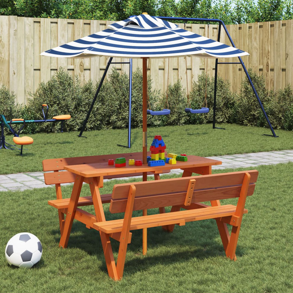 Create a stylish and practical outdoor play area with the Furniture in Fashion Zivelo Outdoor Solid Wood Picnic Table Set with Blue Umbrella in Dark Brown, designed to combine durability, safety, and modern appeal. Crafted from high-quality solid fir wood, this sturdy picnic table set features a rich dark brown finish that adds a premium and elegant touch to any garden, patio, or backyard space while ensuring long-lasting outdoor performance. Perfectly sized for children, this all-in-one picnic table and bench set includes a vibrant blue umbrella that provides essential shade and protection from the sun. With its strong A-frame construction and child-friendly design, it creates a safe, comfortable, and fun environment where kids can enjoy meals, playtime, and social activities outdoors. Built for everyday use, it offers both functionality and lasting reliability. The Furniture in Fashion Zivelo Outdoor Solid Wood Picnic Table Set with Blue Umbrella in Dark Brown is a perfect blend of durability, comfort, and playful design. With its sturdy wooden build and protective umbrella, it creates a safe and enjoyable outdoor space where children can relax, dine, and make lasting memories. FEATURES: Material: Solid fir wood (untreated), Polyester, Hardwood Finish: Dark Brown, Multicolour This picnic table with umbrella is perfect for patios, gardens, and outdoor spaces, providing a comfortable and inviting spot for your kids and their friends to relax and enjoy 2-in-1 table and bench set: The picnic table with benches is ideal for kids' parties and gatherings, providing ample space for food, drinks, and accessories, as well as comfortable seating for children to enjoy their childhood memories This picnic table is crafted from solid fir wood, ensuring stability, durability, and longevity This picnic table features a W-shaped structure, ensuring stability and safety for kids engaging in various activities Made from durable polyester, the outdoor umbrella offers pr
